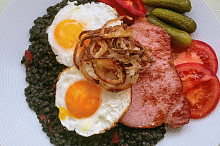 Černá čočka beluga s rajčaty, kapií, uzeným masem a volskými oky