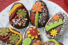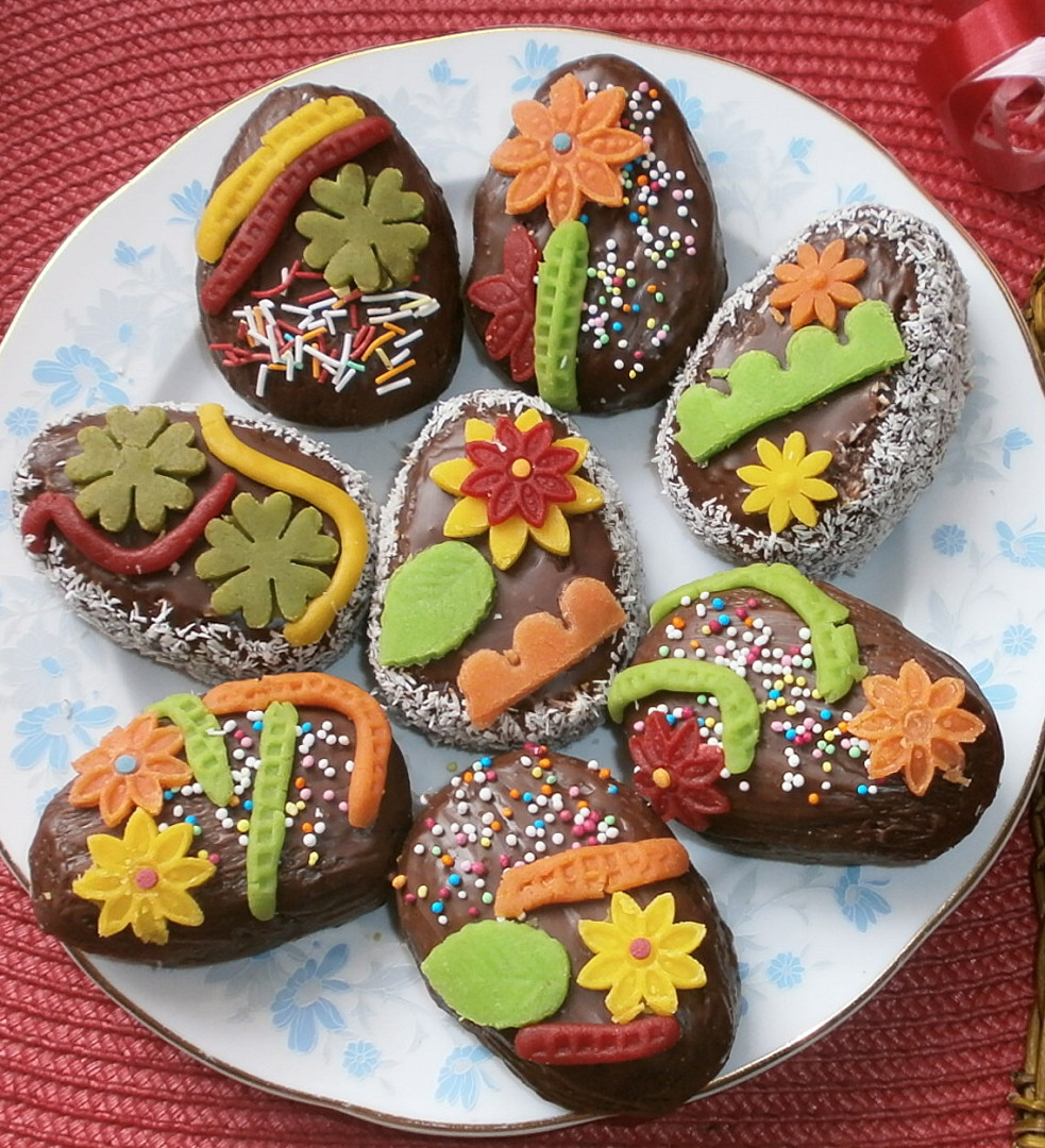 Velikonoční piškotová vajíčka zdobená čokoládou a marcipánem