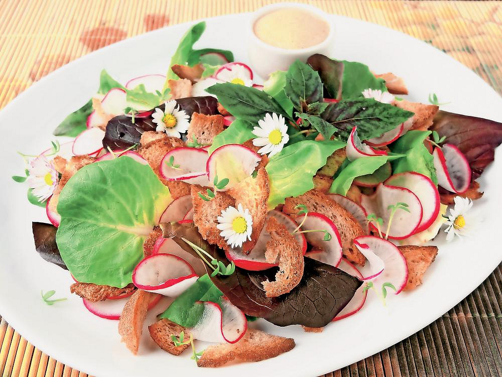Krok 4: Připravené topinky, saláty a ředkvičky rozložíme na čtyři talíře. Posypeme řeřichou, můžeme ozdobit sedmikráskami.