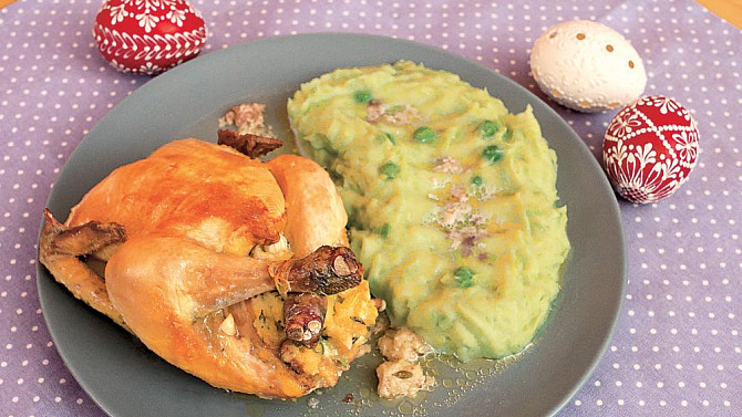 Jarní kuřátka s mandlovou nádivkou připravte ke svátečnímu obědu či k večeři. Mandlová nádivka s cibulkou krásně nasákne chuť i vůni masa a doslova se vám rozplyne na jazyku. Bramborová kaše s hráškem dodá jídlu svěží vzhed.