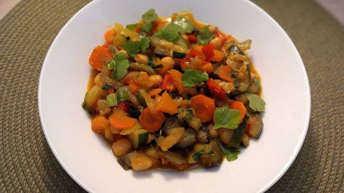 Máslová dýně s lilkem, paprikami, mrkví a cizrnou