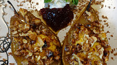 Krok 4: Podáváme se šlehačkou, brusinkovým džemem a nastrouhanou čokoládou. Pokud nám med steče na pečicí papír, tak s ním polijeme hrušky na talíři.