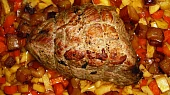 Krok 4: Následně přendáme orestovanou zeleninu do pekáče a do vytvořeného důlku v zelenině vložíme špalek masa. Podlejeme cca 3 dcl vody, přikryjeme a pečeme na poloviční výkon trouby cca 2 hodiny. Mezítím můžeme maso otočit.