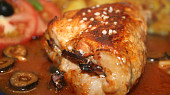 Plněné kotlety v červené omáčce s cibulovými brambory