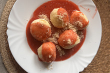 Tvarohové knedlíky s jahodovým pyré a praženou strouhankou