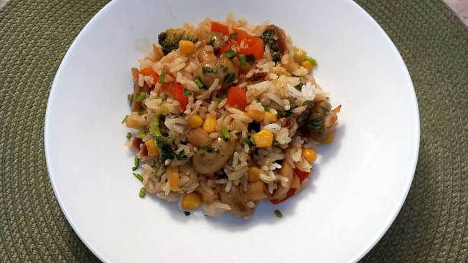 Rýže s brokolicí, kapií, žampiony a kukuřicí