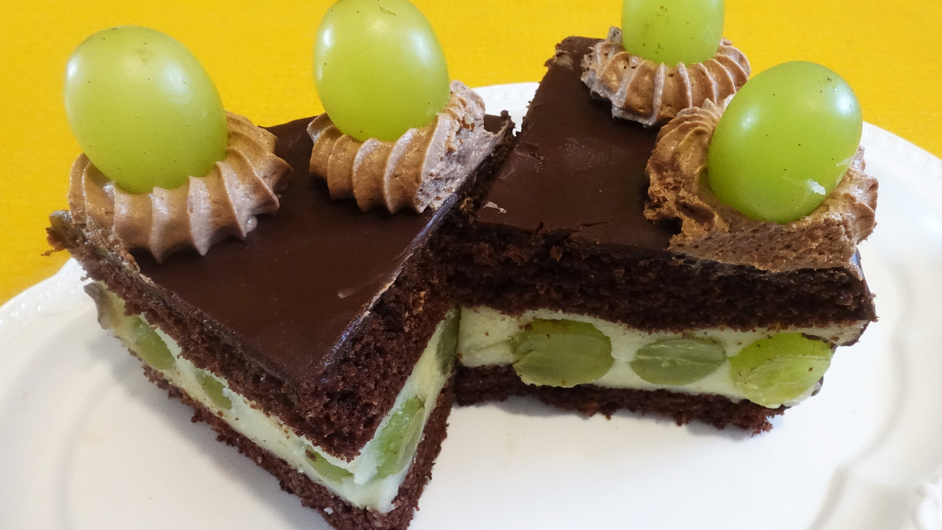 Dortík jen tak na chuť můžeme připravit i do malé formy. Kakaový piškotový korpus protřeme krémem z pudinku a másla. Do něj také naskládáme šťavnaté hroznové víno. Povrch pak ozdobíme pařížskou šlehačkou a čokoládovou polevou.