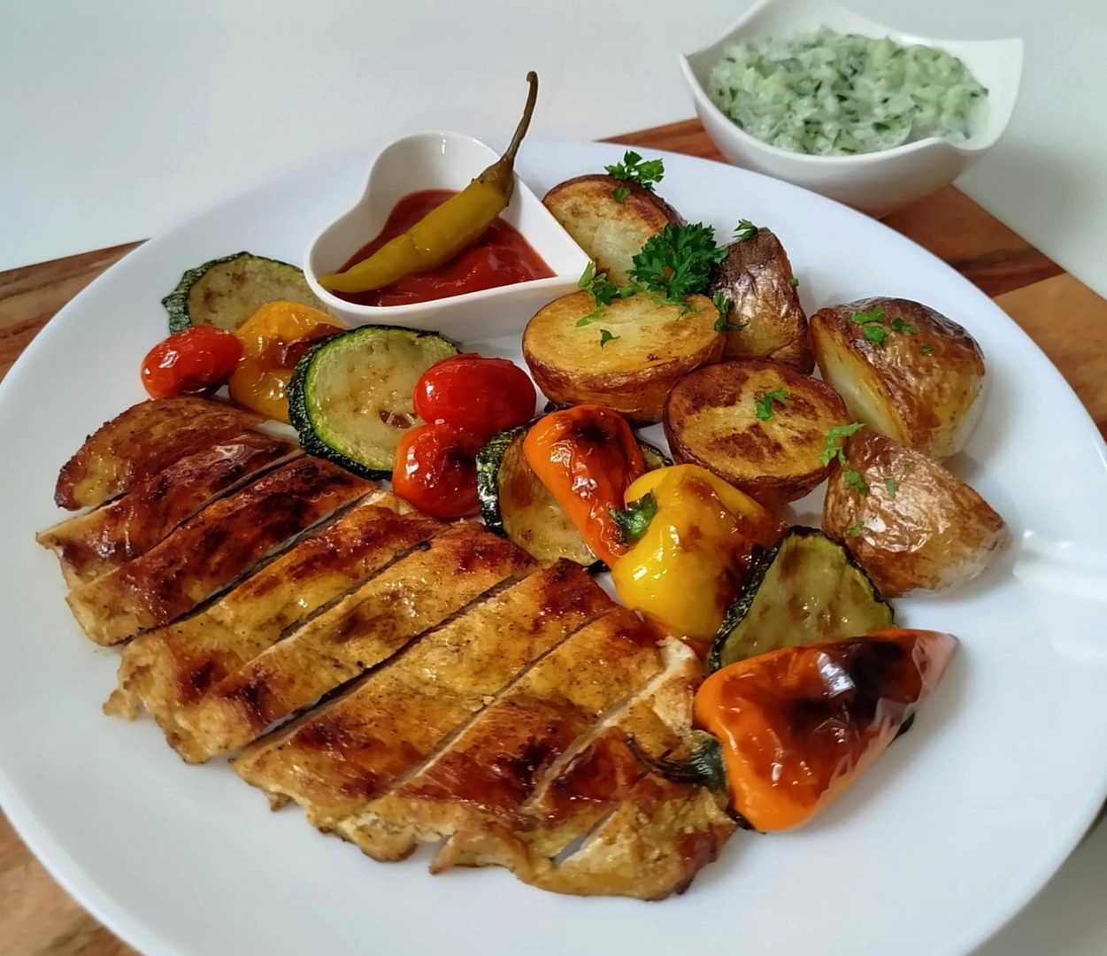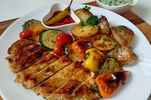 Grilovaný kuřecí steak se zeleninou a dipem