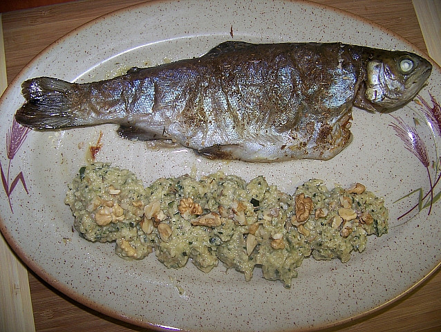Pečený pstruh je sám o sobě dokonalou pochoutkou. Tentokrát jej upečeme i s cuketou a česnekem. Z cukety pak připravíme pyré, do kterého přidáme také vlašské ořechy. Ořechová chuť se skvěle skloubí s jemným masem pstruha.