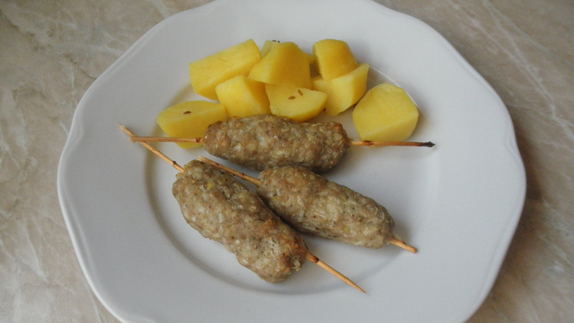 Krok 2: Vzniklou masovou směs tvarujeme do válečků, které napíchneme na špejli, a dáme na plech vyložený pečicím papírem.