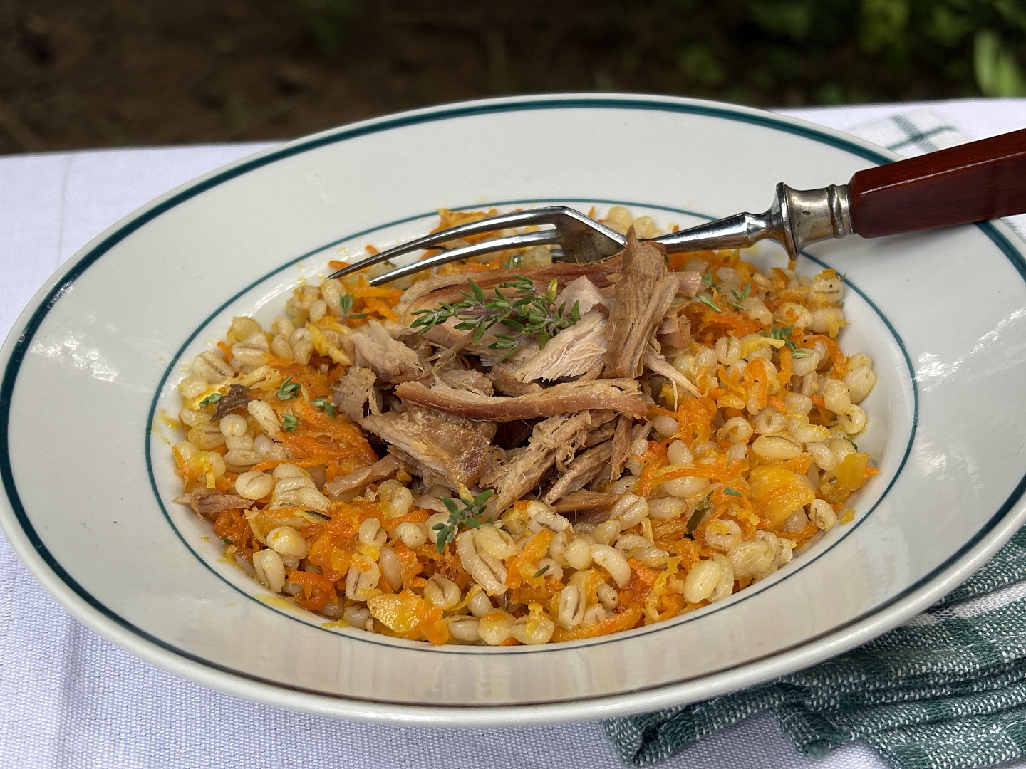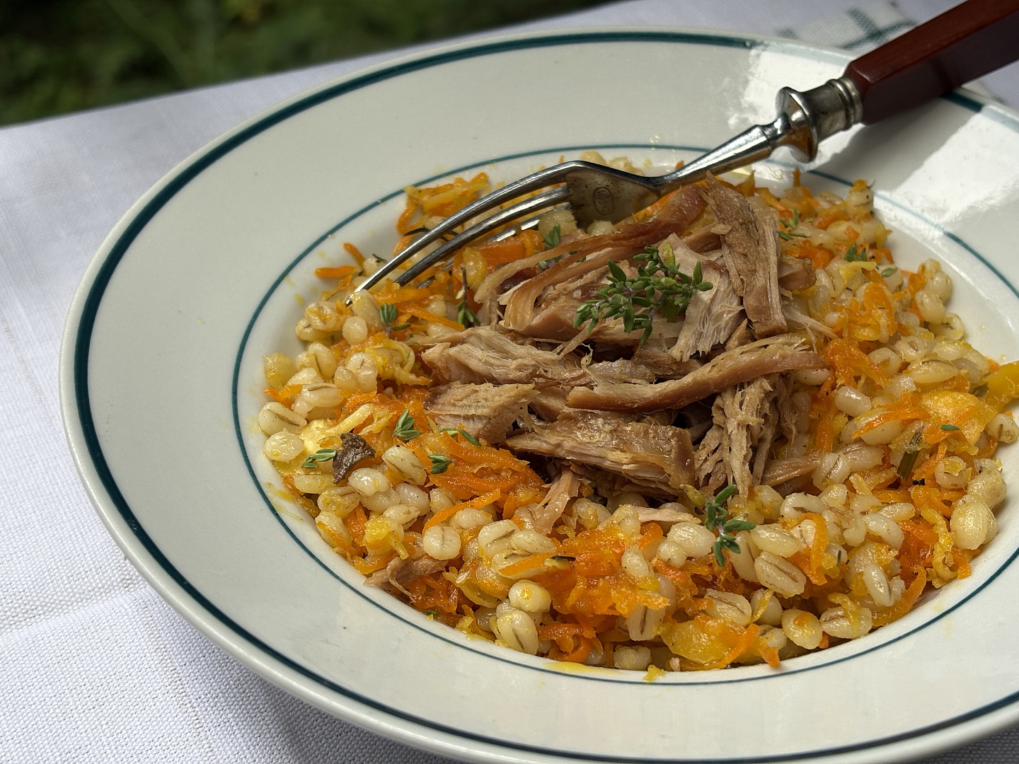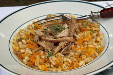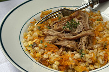 Kroupy s kořenovou zeleninou a trhaným vepřovým masem