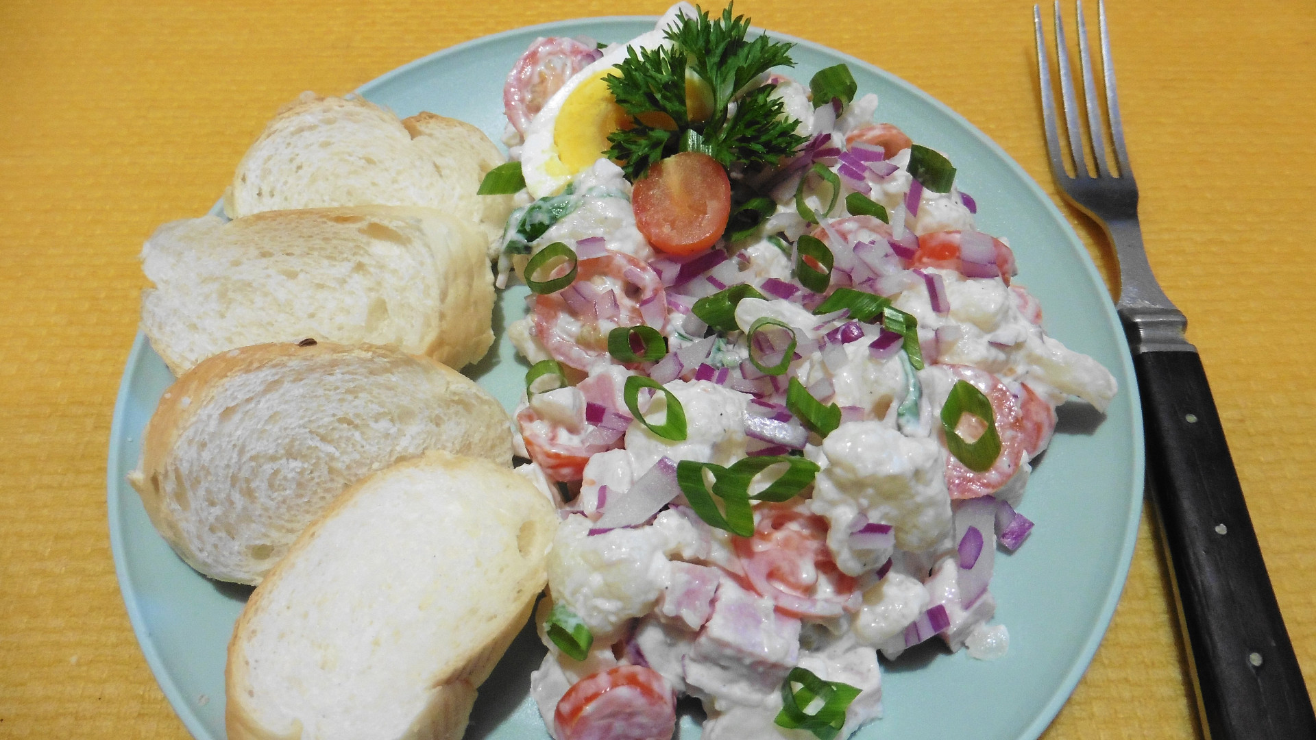 Květák je skvělou potravinou, ze které připravíme nepřeberné množství pokrmů. Použít jej můžeme i jako základ na salát. Povařené růžičky květáku a jeho košťálu doplní šunka, rajčata a dresink z majonézy, jogurtu a hořčice.