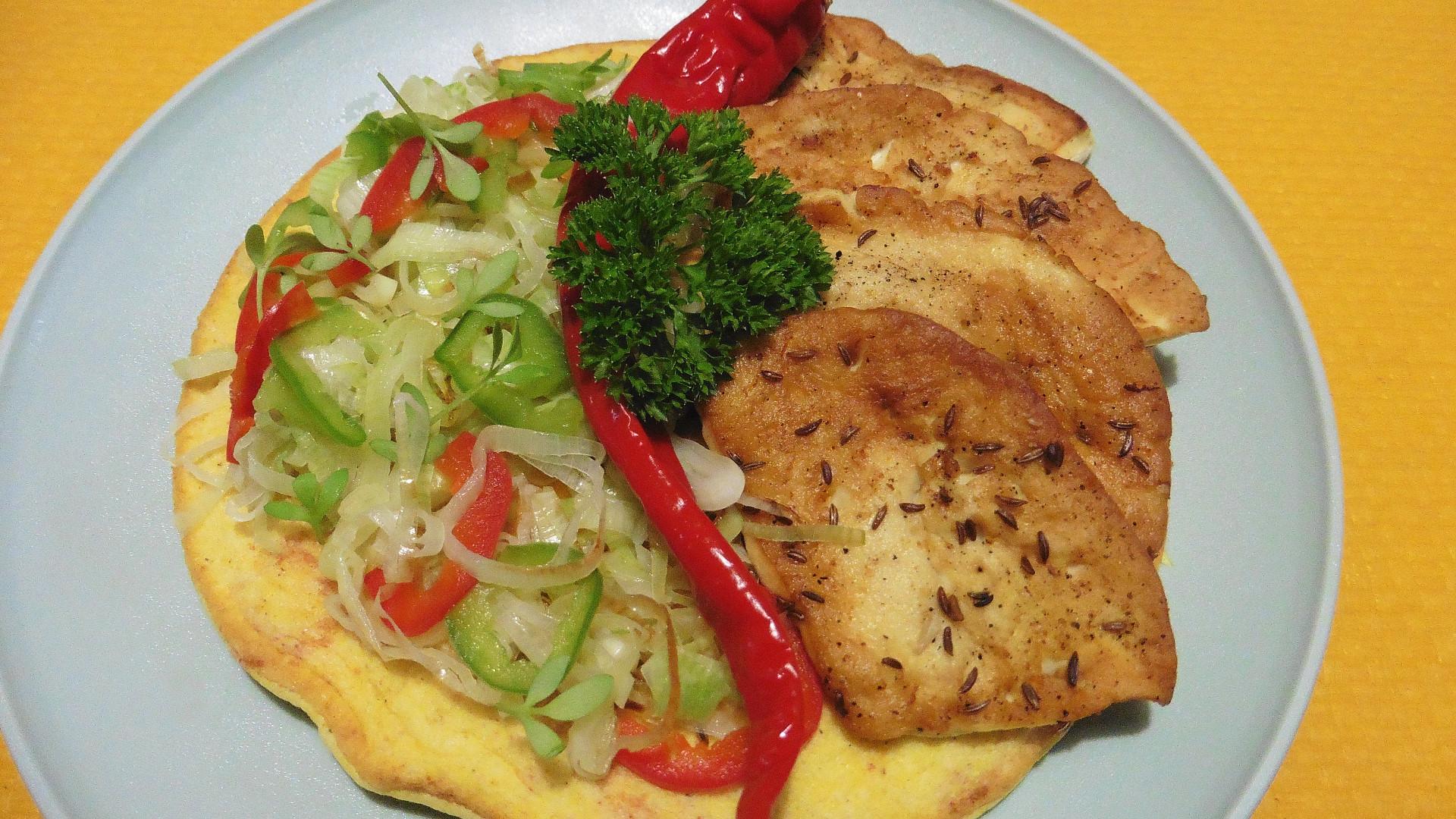 Krok 1: Omelety: Vejce prošleháme se smetanou a mouku, do které přidáme kypřicí prášek do pečiva. Osolíme, opepříme a zamícháme. Dno pánve vytřeme olejem a postupně na něm opečeme čtyři silnější omelety.