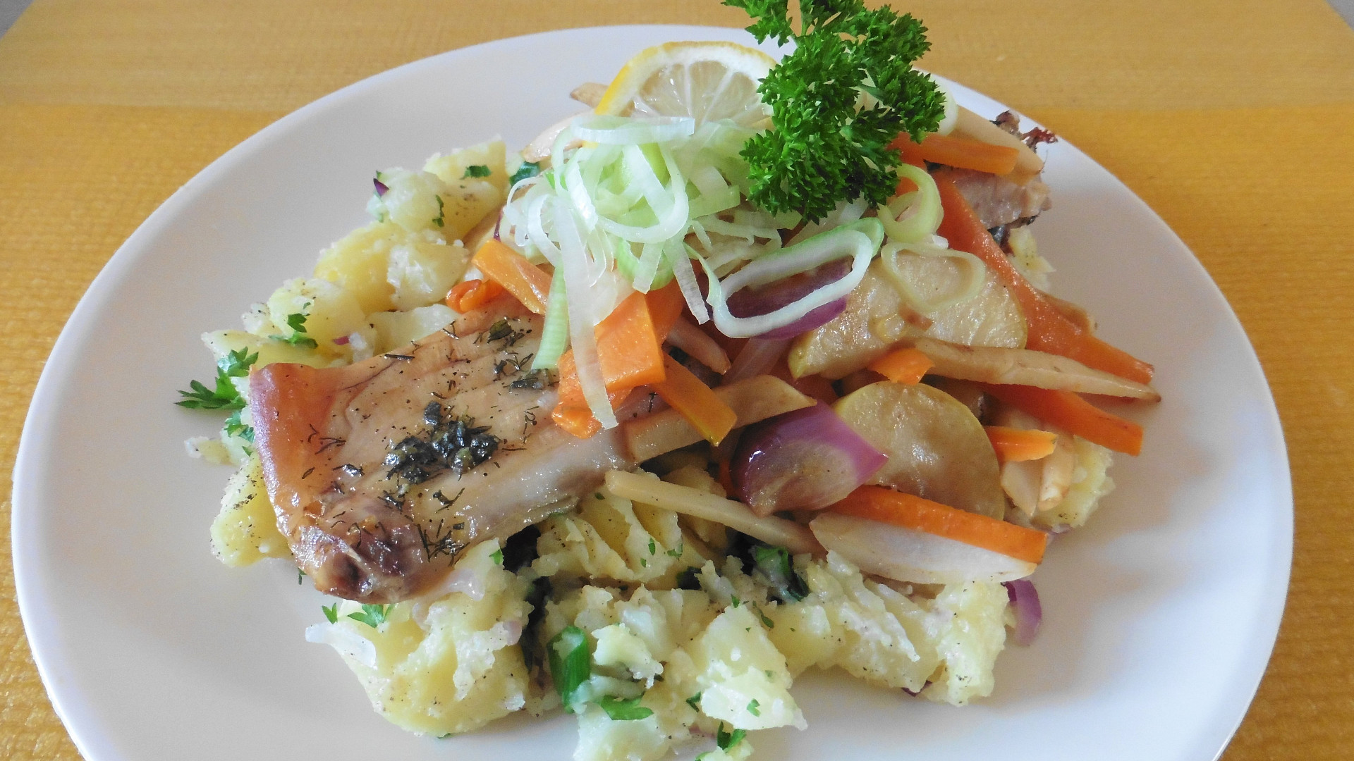 Pečený kapr s kořenovou zeleninou a jablíčky
