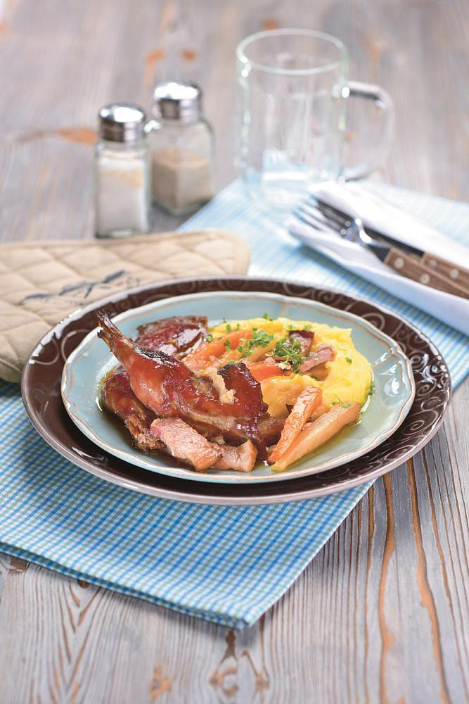 Krok 7: Bažantí stehna rozdělíme na talíře, přidáme opečenou zeleninu i slaninu a podáváme nejlépe s bramborovou kaší. Můžeme ještě ozdobit oblíbenou bylinkou.