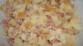 Krok 1: Brambory nastrouháme, salám a rohlíky nakrájíme na kostičky, přidáme sůl a vše promícháme.