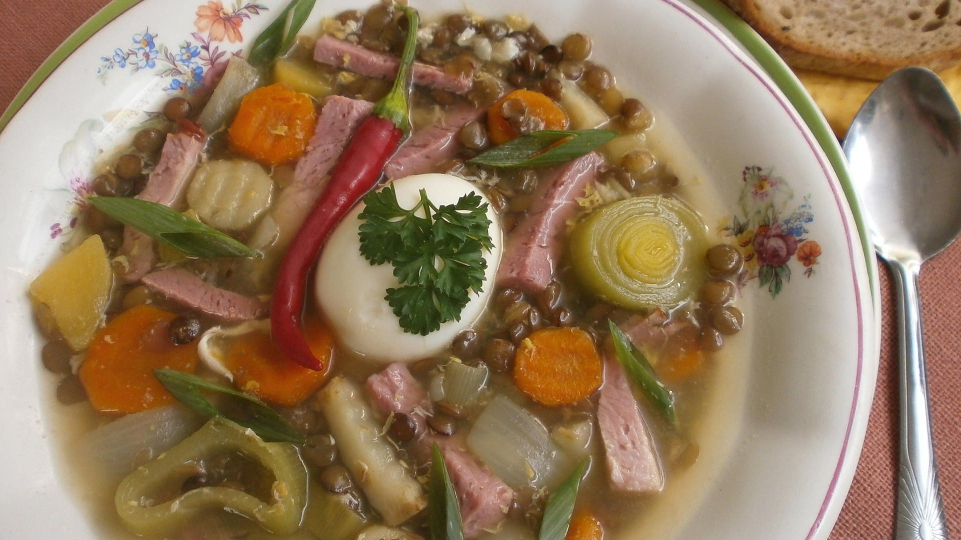 Bohatá zeleninová polévka s čočkou a uzeným masem bez problému zasytí stejně dobře jako hlavní chod. Restovaná kořenová zelenina tvoří poctivý základ, uzené maso zvýrazní její chuť. Na talíři ji můžete ještě vylepšit celým vařeným vejcem.