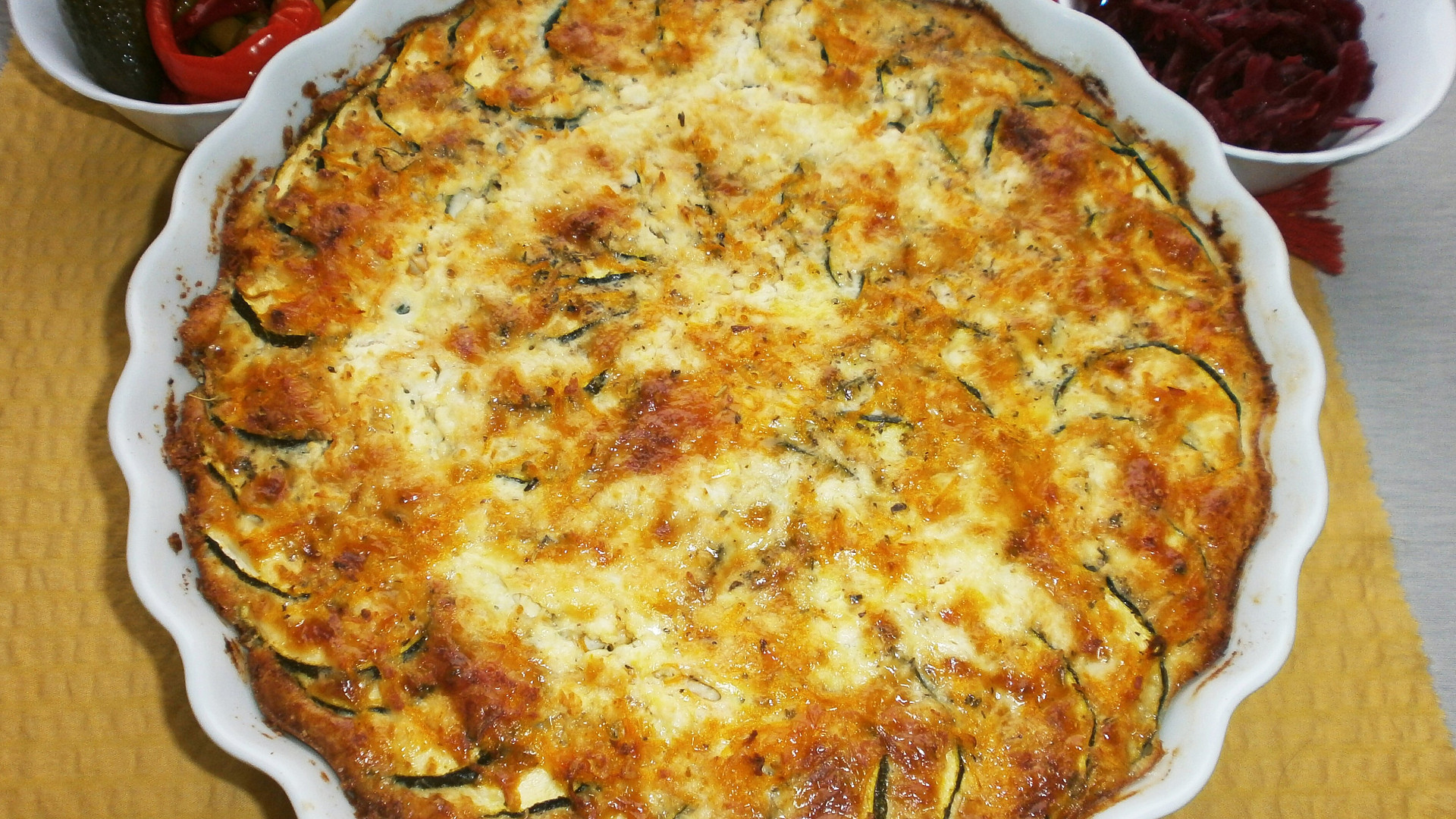 Překvapte své hosty zdravým pohoštěním. Tento nápaditý koláč nepotřebuje ani špetku mouky. Jemný rýžový základ z vajec a sýru nese vrstvu nastrouhané mrkve a tenkých plátků cukety, které propojí krémová náplň z fety a zakysané smetany.