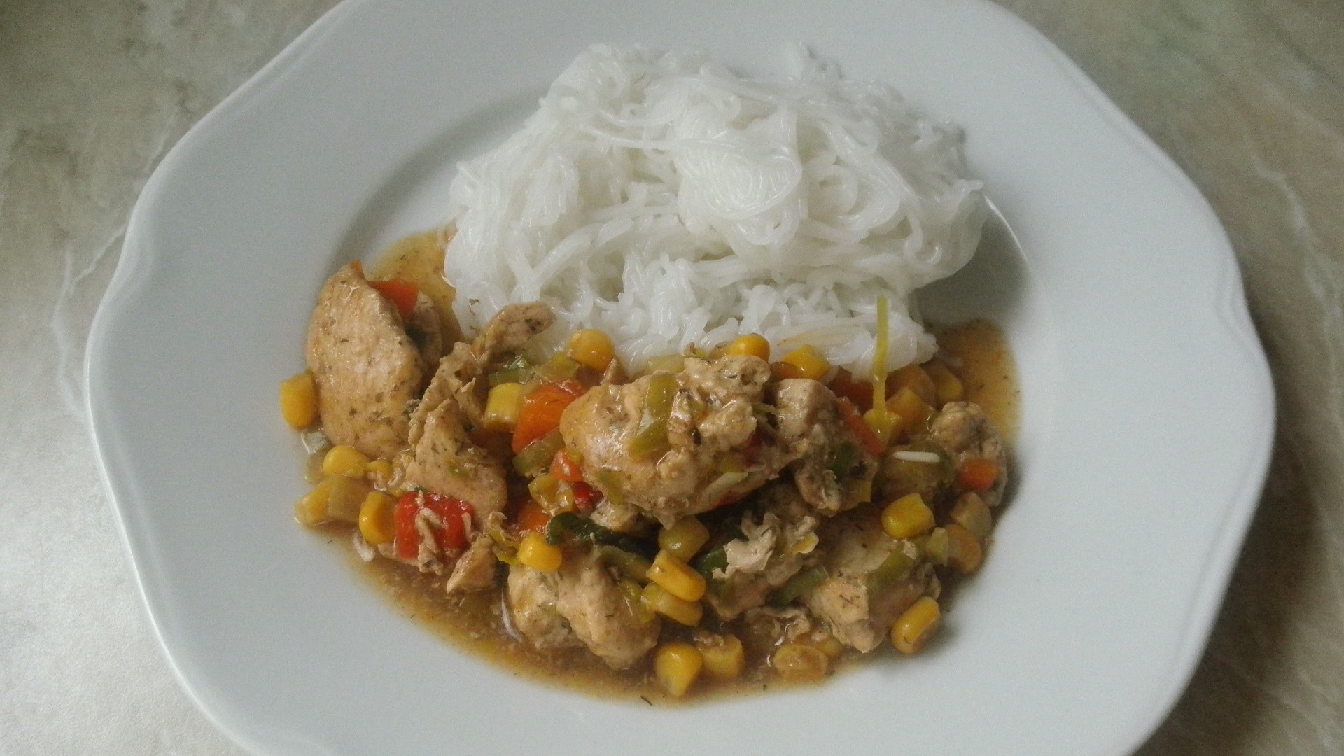 Šťavnaté kousky kuřecího masa v pikantní omáčce, doplněné sladkou kukuřicí jsou rychlé jídlo, které voní po koření a lehce pálí. Ideální jídlo které zahřeje, zasytí a bude chutnat každému, kdo má rád trochu ohně na talíři.