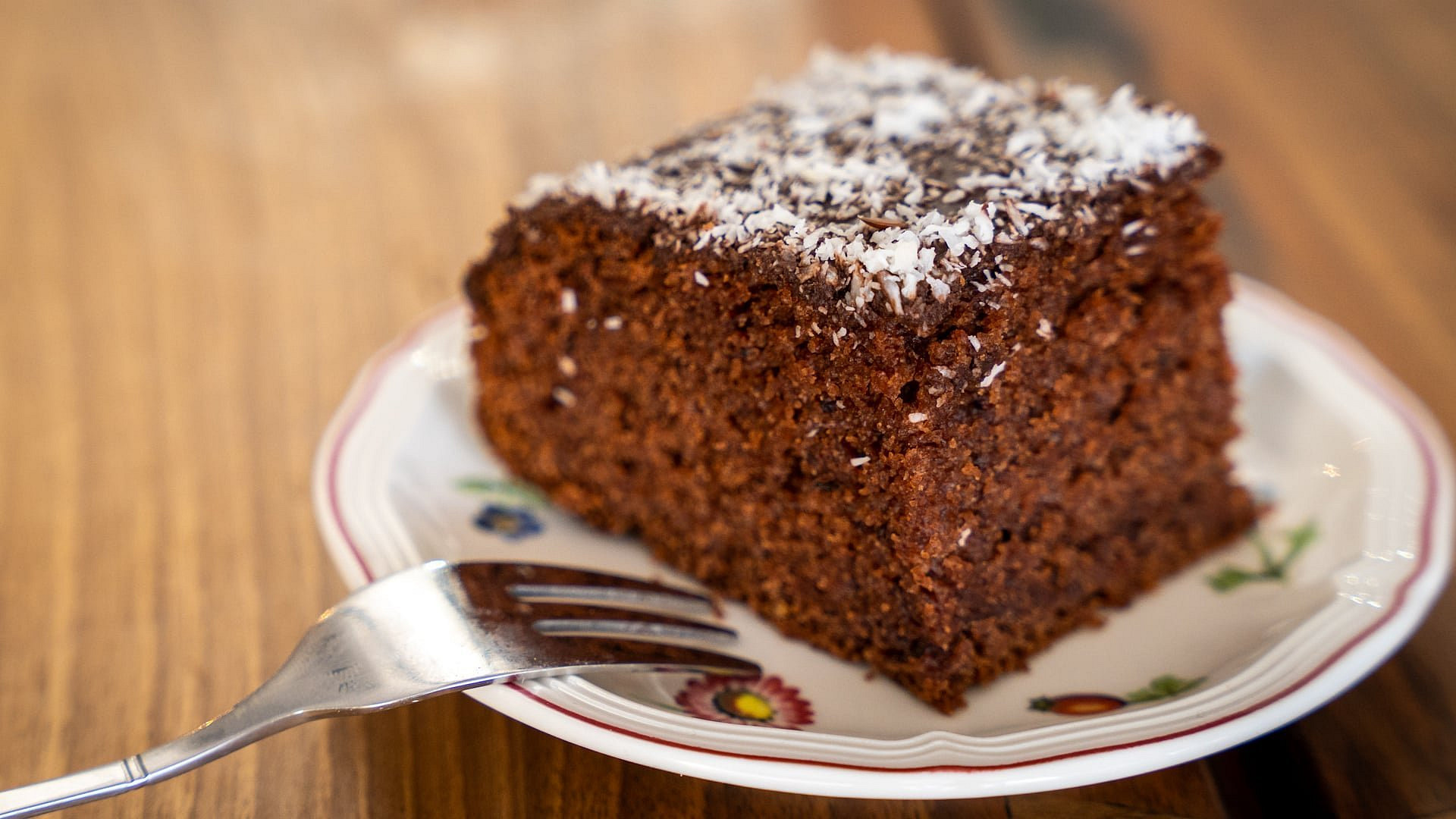 Krok 6: Upečený perník necháme úplně vychladnout. Poté ho promažeme vrstvou marmelády (nebojte se dát jí více – krásně zvláční těsto), přelijeme rozpuštěnou čokoládou a nakonec posypeme kokosem.
