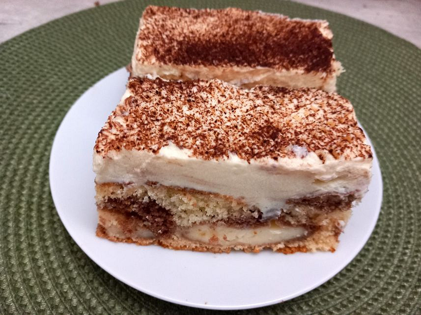 Vláčný a nadýchaný piškotový korpus, prolévaný vanilkovým pudinkem, korunuje vrstva z vyšlehaného máslovo-smetanového krému. Na závěr stačí moučník poprášit kakaem a nakrájet na řezy a dokonalý zákusek k odpolední kávě je na světě.