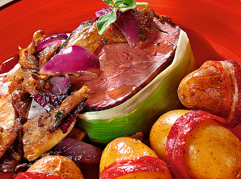 Krok 4: Pekáč přendáme do trouby a maso pečeme při 160 °C 20 minut. Pak maso zabalíme do lehce spařeného pórku a při nižší teplotě dopékáme asi 15 minut.
