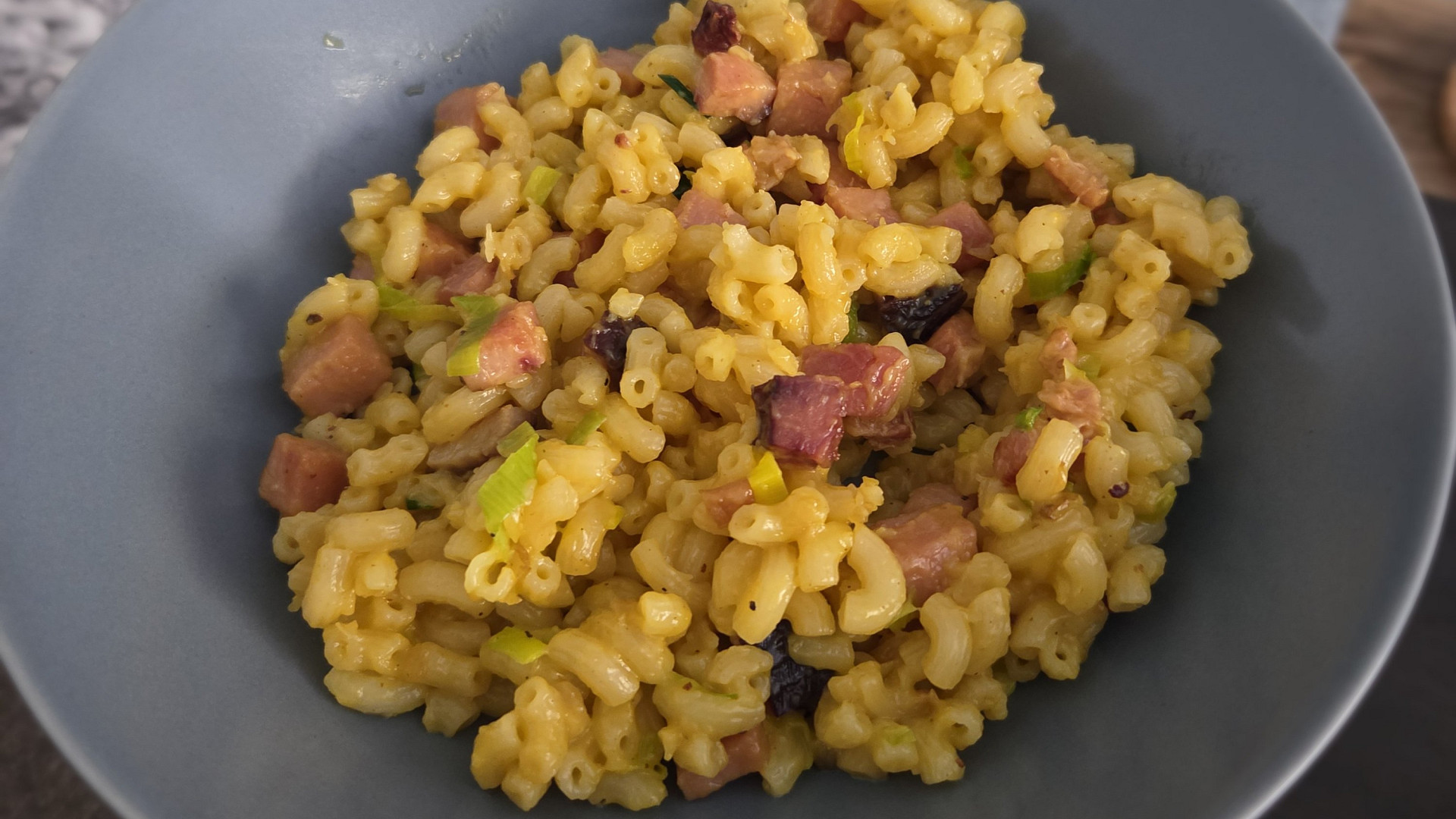 Krok 5: Poté přidáme pórek a zarestujeme. Nakonec přidáme těstoviny, promícháme a restujeme zhruba 5 minut.