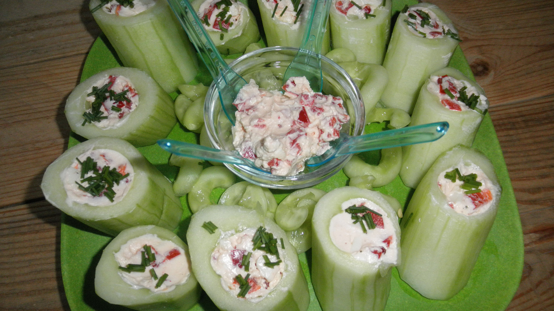 Plněné okurky s kapiovou pomazánkou můžete podávat jako skvělý předkrm nebo zdravou svačinku. Špalíčky z okurek stačí jednoduše vydlabat a naplnit odlehčenou pomazánkou s tvarohem a taveným sýrem. Pažitka předkrm krásně ozdobí.