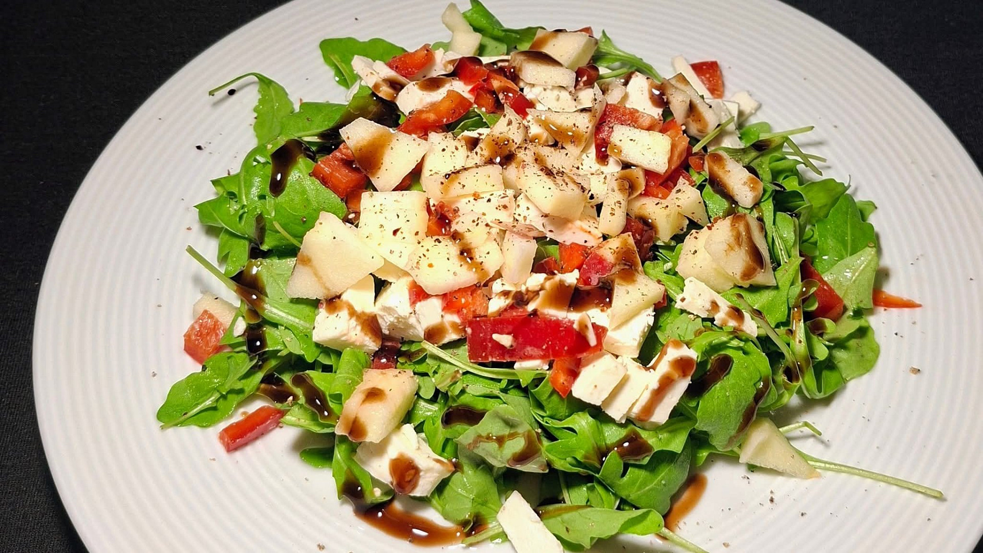 Štiplavá chuť čerstvých rukolových lístků se dokonale snoubí s osvěžující šťavnatostí čerstvého jablka a křupavé kapie. Ty pak doplní svou slanou chutí balkánský sýr a lehce kyselý balsamikový krém.