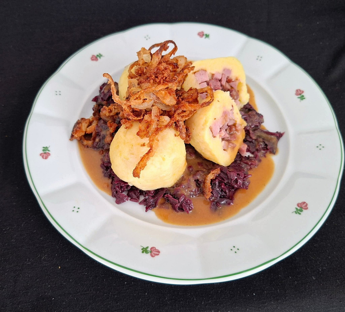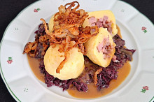 Bramborové knedlíky s uzeným masem, cibulkou a sosíkem