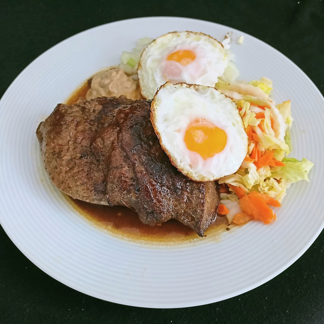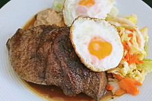 Restovaná vepřová játra, volská oka a zeleninový salát