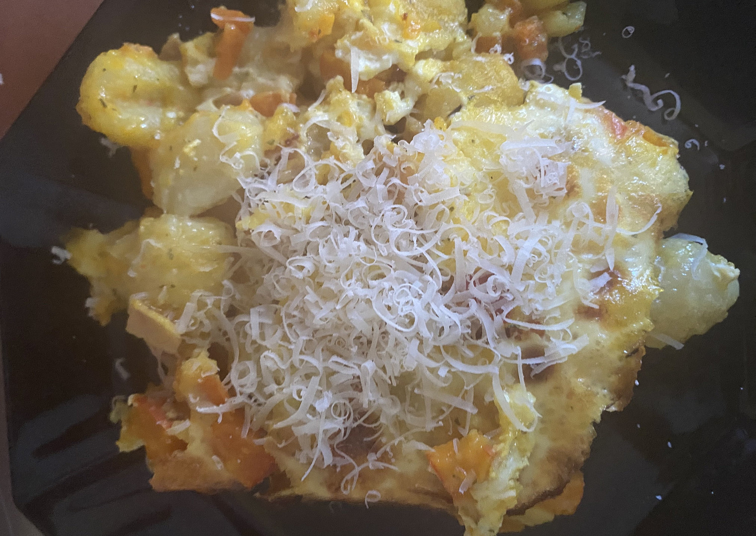 Jednoduché vegetariánské jídlo z nasládlé dýně Hokkaidó, chlazených gnocchi a parmazánu. Příprava je rychlá, bez předvaření. Vše se jen promíchá a zapeče. Pro výraznější chuť, můžete přidat i plátky kvalitní parmské šunky nebo slaninu.