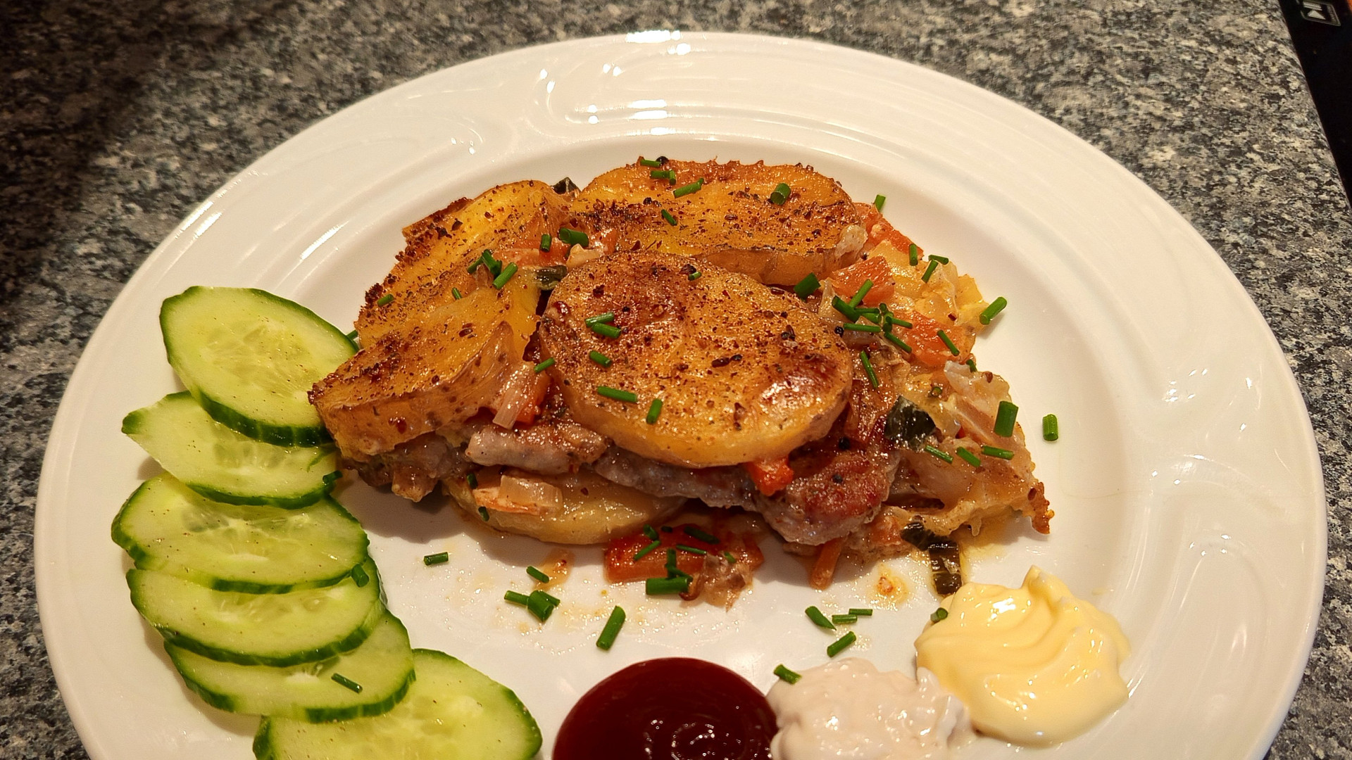 Kousky šťavnaté krkovice, vrstvy brambor a pestrá zelenina se v troubě spojí do dokonale propečeného jídla, které vás zasytí. Ideální volba pro rodinný oběd nebo večeři, kdy chcete mít všechno v jednom pekáči.