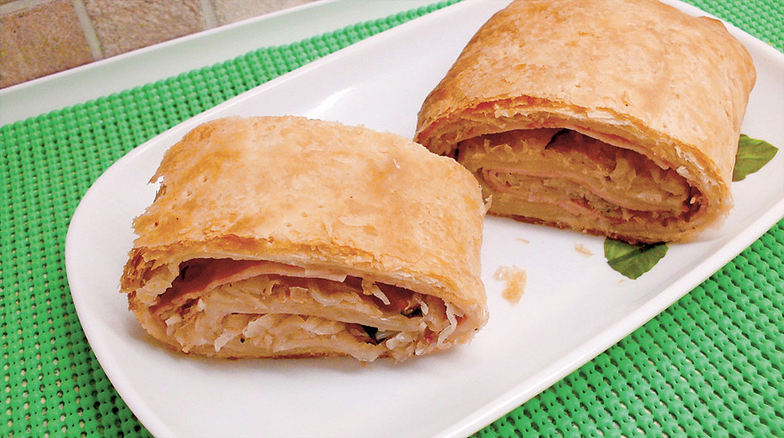 Slaný závin z listového těsta s kysaným zelím je výbornou volbou pro rychlou večeři nebo pohoštění. Křehké těsto ukrývá voňavou náplň, skládající se ze šunky, dušeného zelí a dokřupava usmažené slaniny. Neváhejte a pusťte se do pečení.