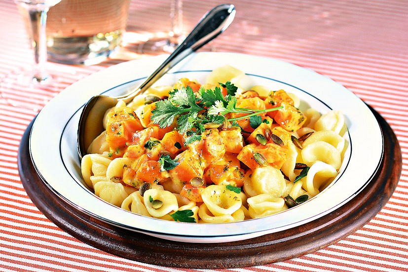 Těstoviny s kořeněnou dýňovou směsí jsou jednoduchým podzimním jídlem plným zajímavé chuti, o kterou se postará sladká dýně, koriandr a aromatická kurkuma. Omáčka je hotová během chvilky a v kombinaci s těstovinami a křupavými semínky vytvoří rychlý, sytý oběd.