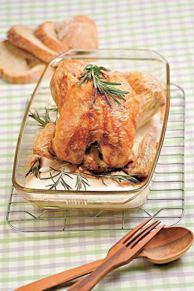 Krok 5: Krátce před koncem pečení posypeme kuře a solnou krustu nasekanými bylinkami. Upečené kuře vyjmeme, naporcujeme a ozdobíme rozmarýnem.