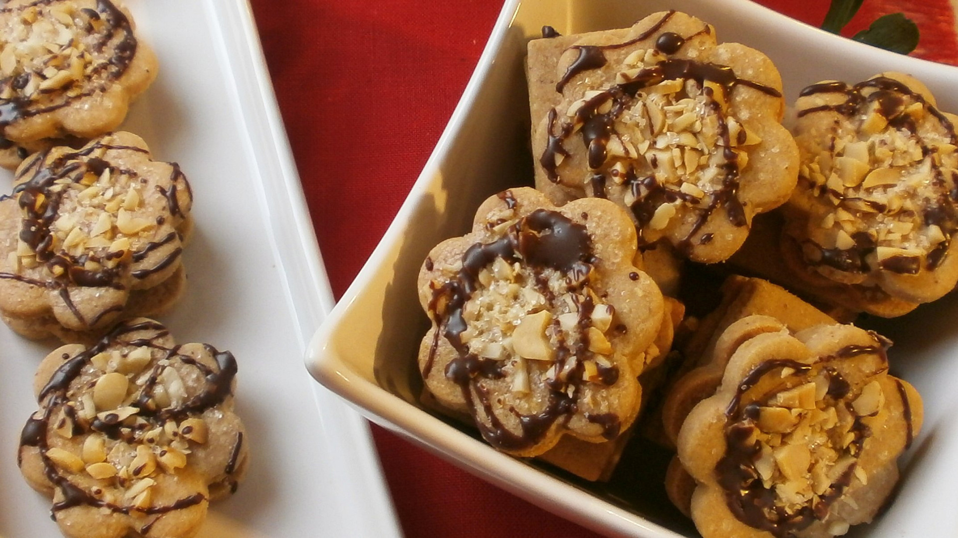 Linecké cukroví netradiční chuti. Jemné máslové těsto provoní vanilka a citron. Do části vykrojených kytiček navíc dáme kousky arašídů. Po upečení je pak slepujeme máslovým krémem z arašídové pomazánky.