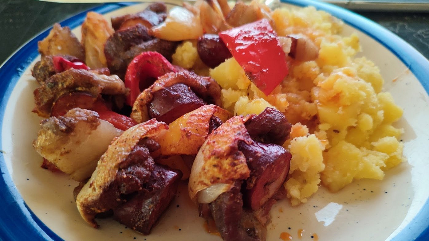 Krok 4: Vezmeme špízové jehly a navlékáme na ně střídavě maso, cibuli, klobásu, papriku, slaninu až do naplnění jehel. Troubu předehřejeme na 165 °C.