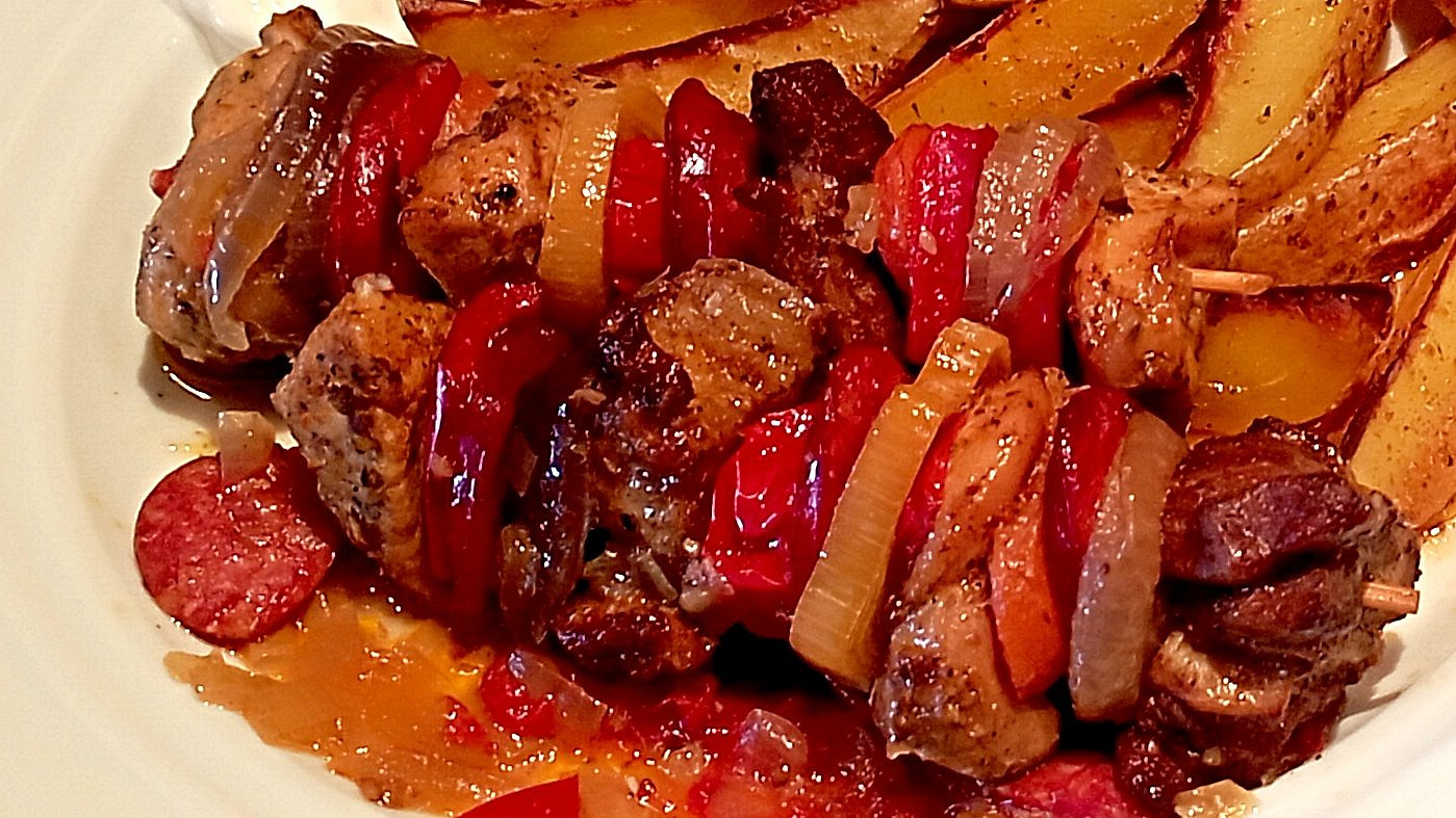 Krok 4: Takto připravené špízy dáme do pekáče i s výpekem z pánve, lehce podlijeme vodou a pečeme doměkka asi 30-40 minut.