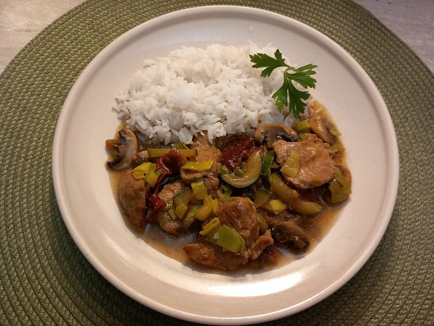 Krok 5: Poté přidáme sušená rajčata a nakonec pórek. Promícháme a krátce orestujeme. Podlijeme zbytkem studeného vývaru, ve kterém jsme rozmíchali solamyl. Přivedeme k varu, podle chuti osolíme a opepříme. Po zhoustnutí omáčky odstavíme.