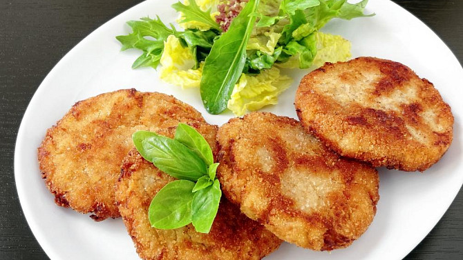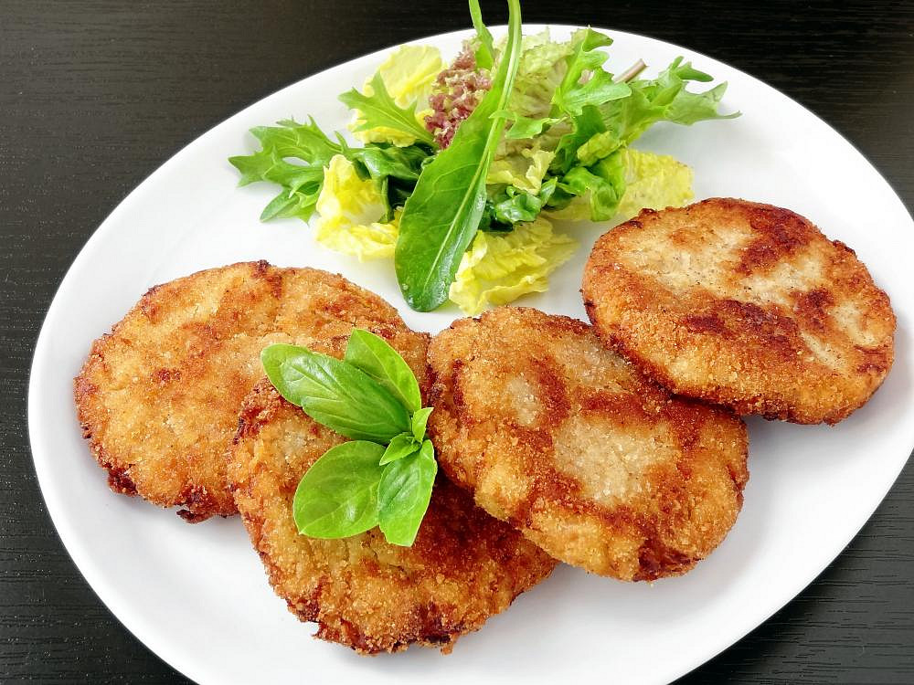 Každý plátek obalíme v hladké mouce, vejcích rozšlehaných se solí a trochou mléka a nakonec ve strouhance. Krok 5: Ve větším množství horkého oleje smažíme placky z obou stran dozlatova. Krok 6: Osmažené placky klademe na papírový ubrousek, který odsaje přebytečný tuk. Krok 7: Hotové placky podáváme se zeleninovým salátem.