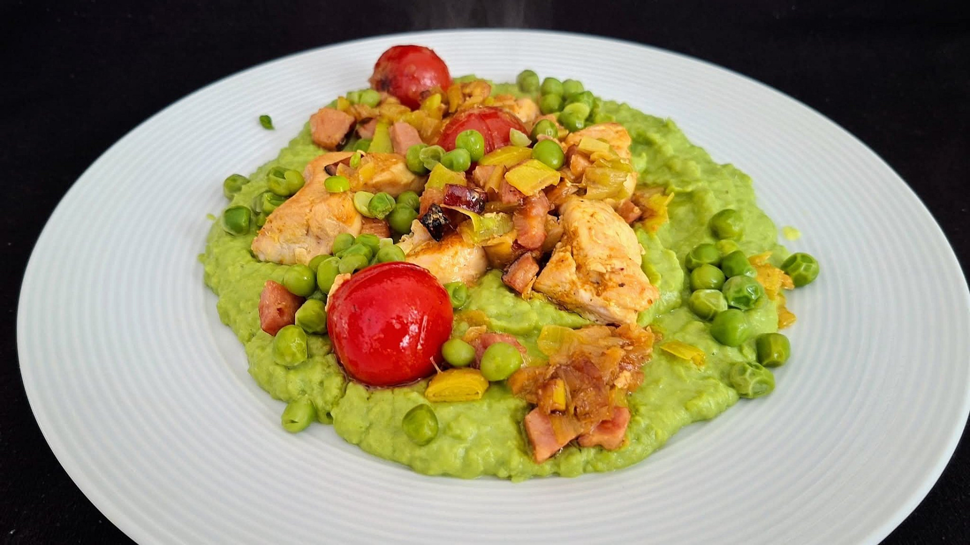 Plnohodnotné jídlo, které vás zasytí, dobře vyživí a ještě je do pár minut hotové? To je přesně toto lahodné hráškové pyré s máslem, které vhodně doplní restované kuřecí kousky se slaninou s cibulkou.