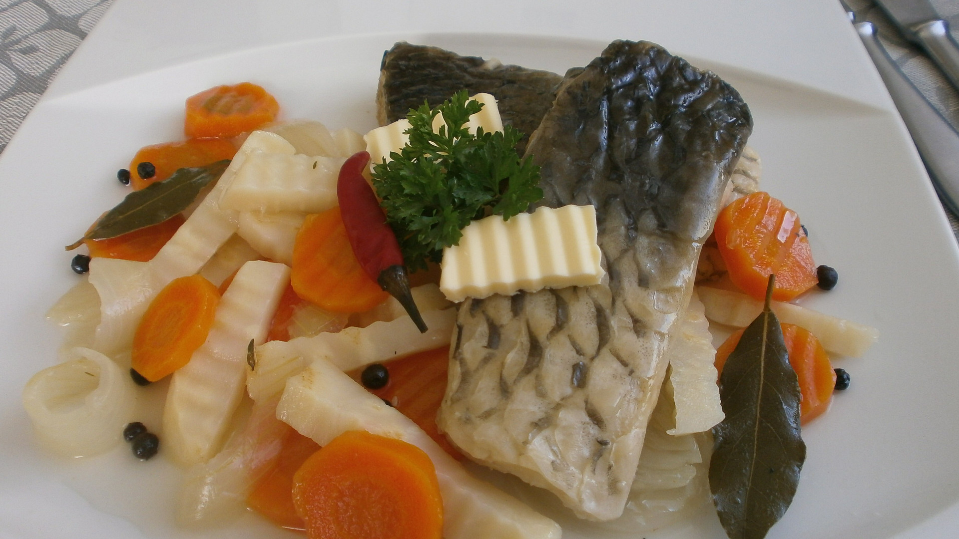 Krok 5: Porce kapra podáváme obložené vařenou zeleninou s kouskem másla. Jako přílohu použijeme chléb nebo brambory.