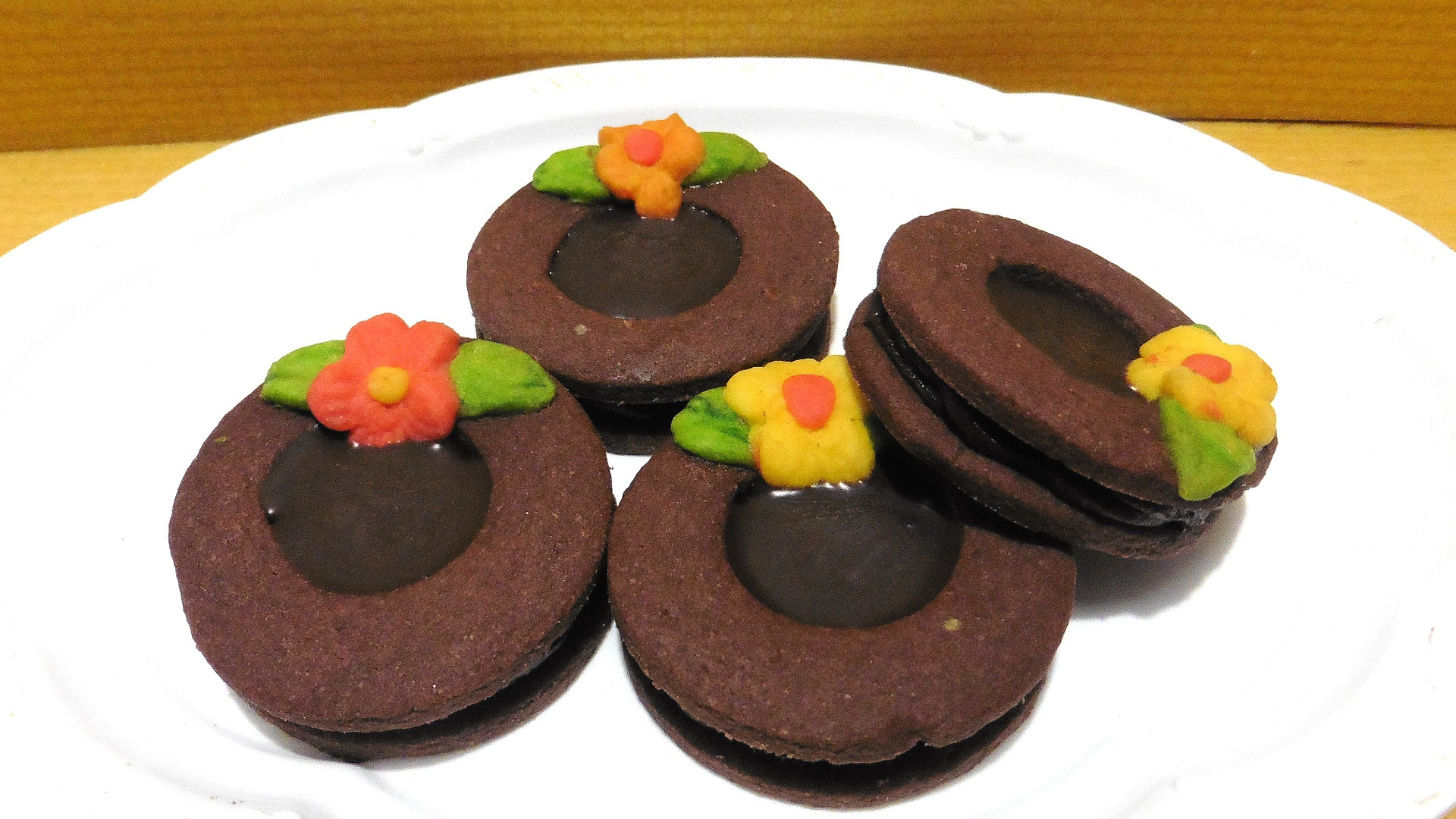 Kakaová kolečka s našlehaným krémem a čokoládou, ozdobená marcipánovými kytičkami, se budou krásně vyjímat nejen na podnose s vánočním cukrovím, ale i na slavnostním stole při narozeninách či výročí. Jsou jemná, efektní a potěší každého milovníka cukroví.