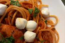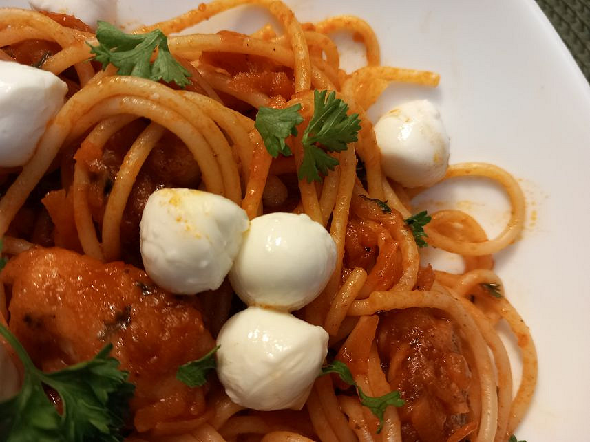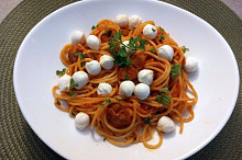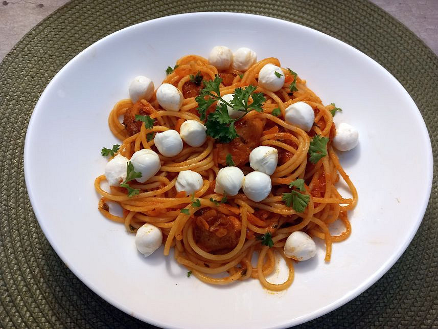 Špagety s kuřecím masem a mrkví v rajčatové omáčce