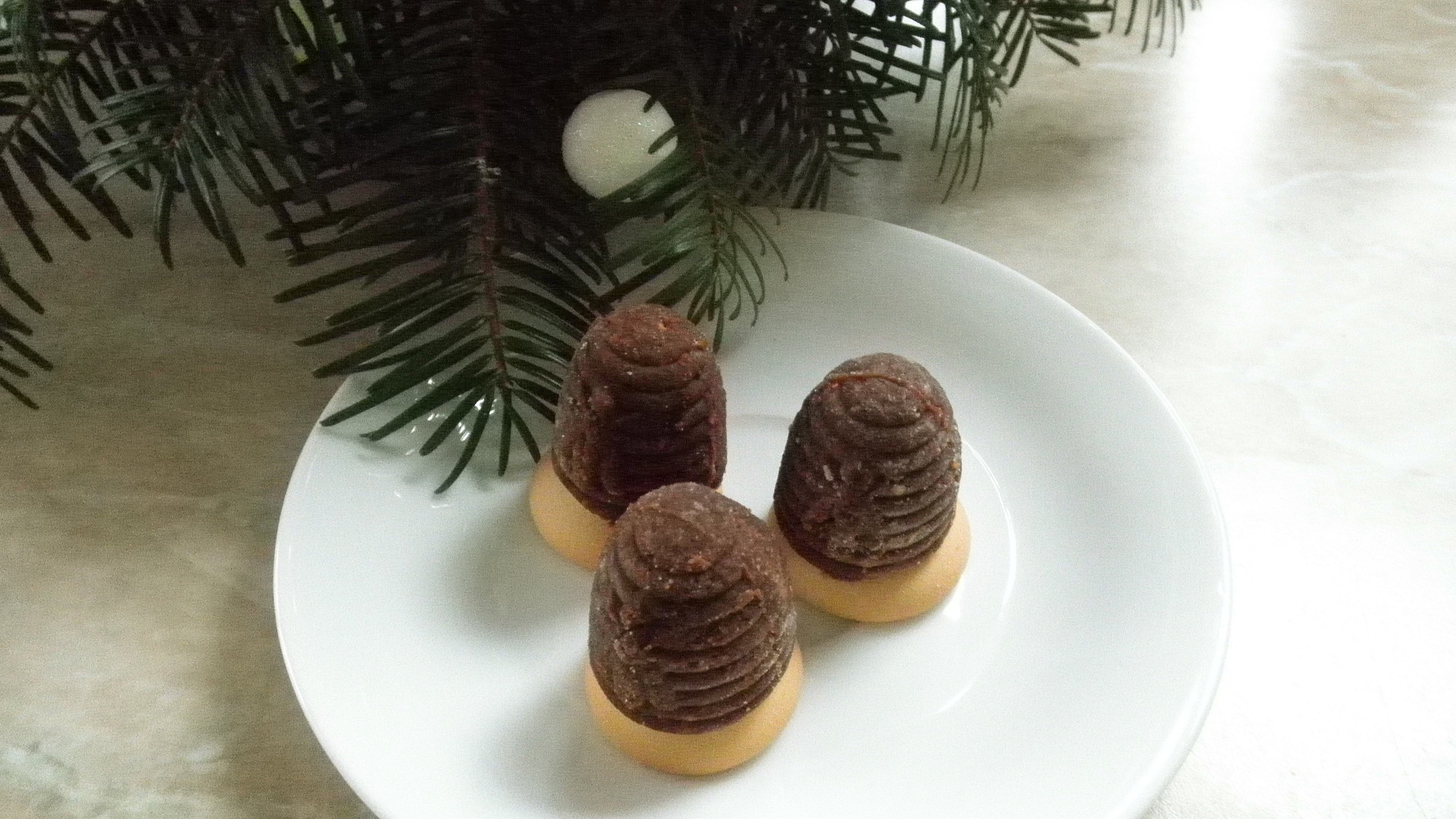 Krok 3: Formičky na vosí hnízda nejprve lehce vysypeme moučkovým cukrem. Do formiček vtlačíme připravené kakaové těsto. Obrácenou měchačkou uděláme do těsta důlek, který pomocí zdobičky naplníme koňakovým krémem. Na dno vosího hnízda přitlačíme celý piškot a opatrně hnízdo vyklepneme z formičky.
