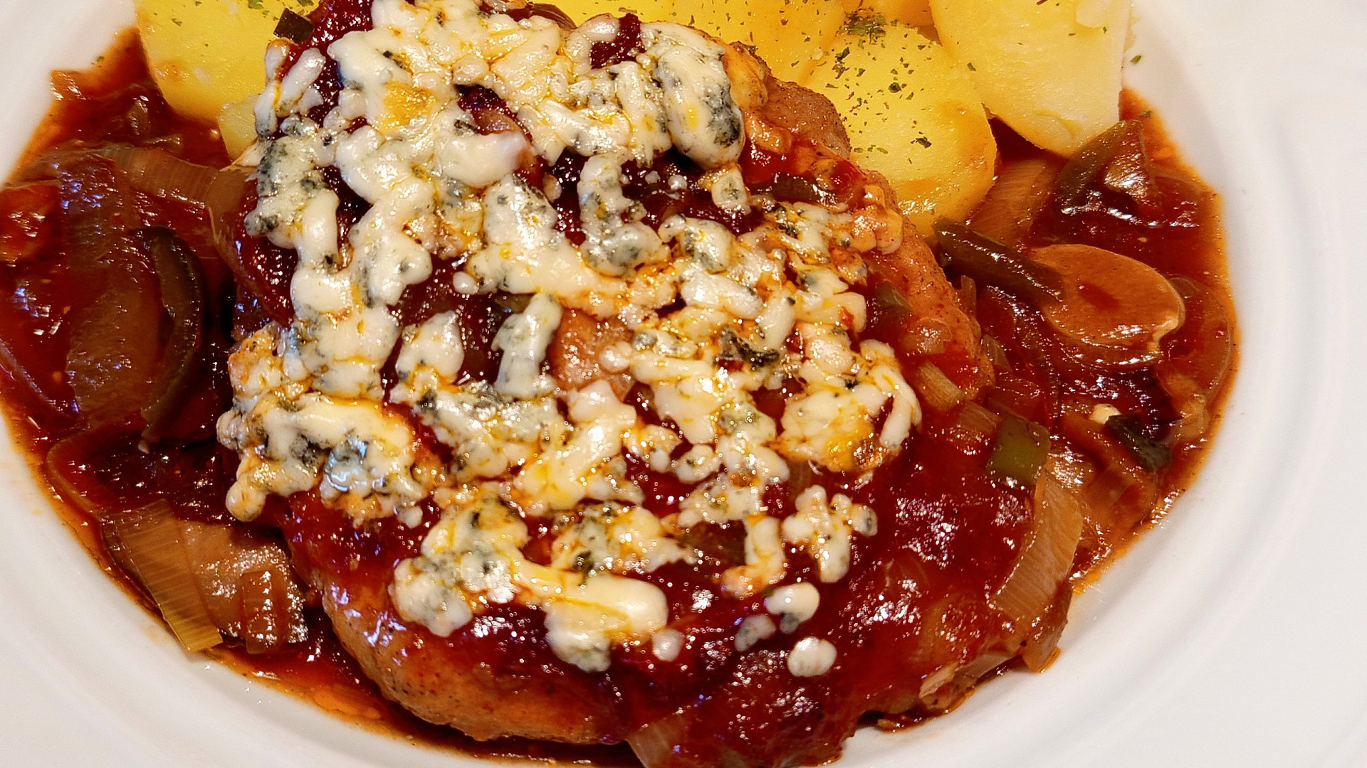 Krkovice na černém pivu se zeleninou a nivovou přikrývkou