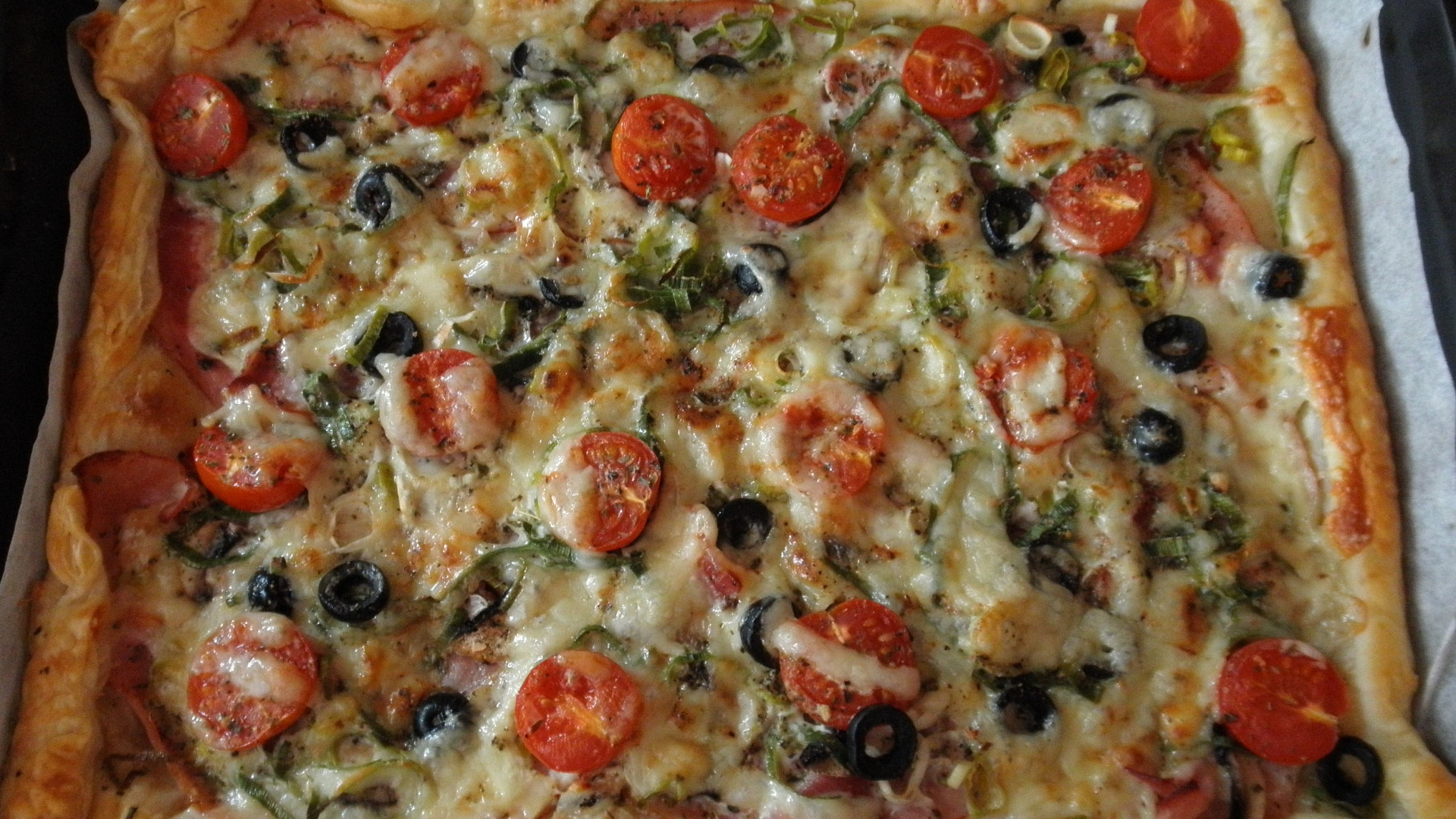 Slaný koláč z listového těsta je skvělou volbou nejen k obědu, ale také na cesty. Chutná skvěle teplý i studený. Koláč obložený šunkou, sýrem, žampiony a olivami není nijak složité připravit. Bez obav se do jeho pečení můžou pustit i začátečníci.