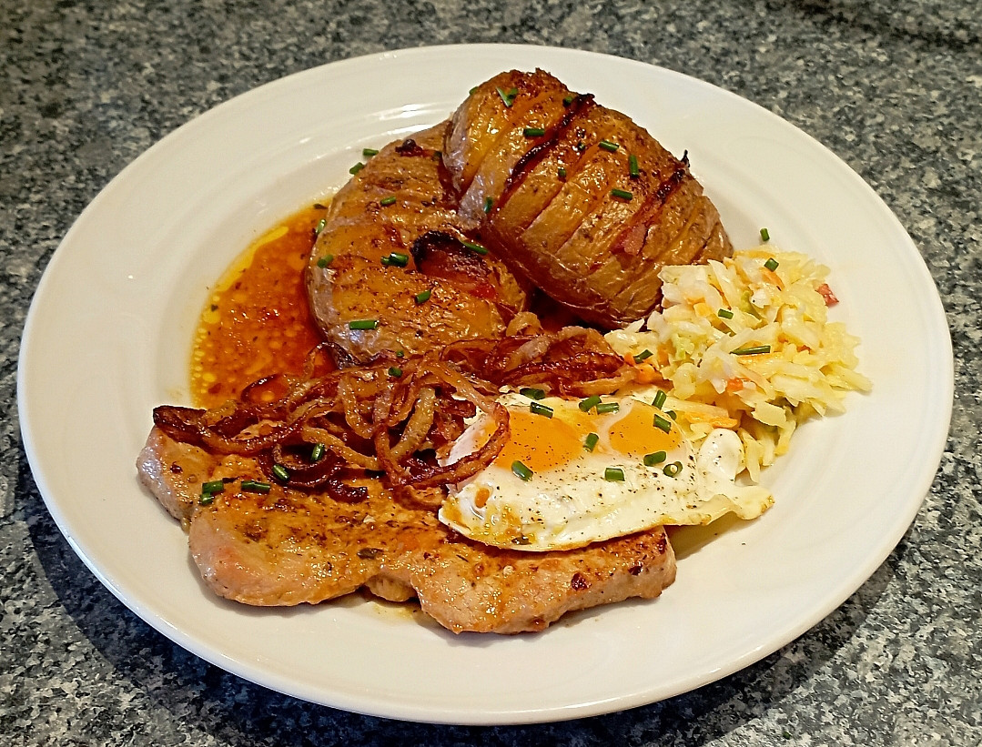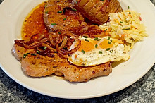 Vepřový steak z kotlety se smaženou cibulí a sazeným vejcem