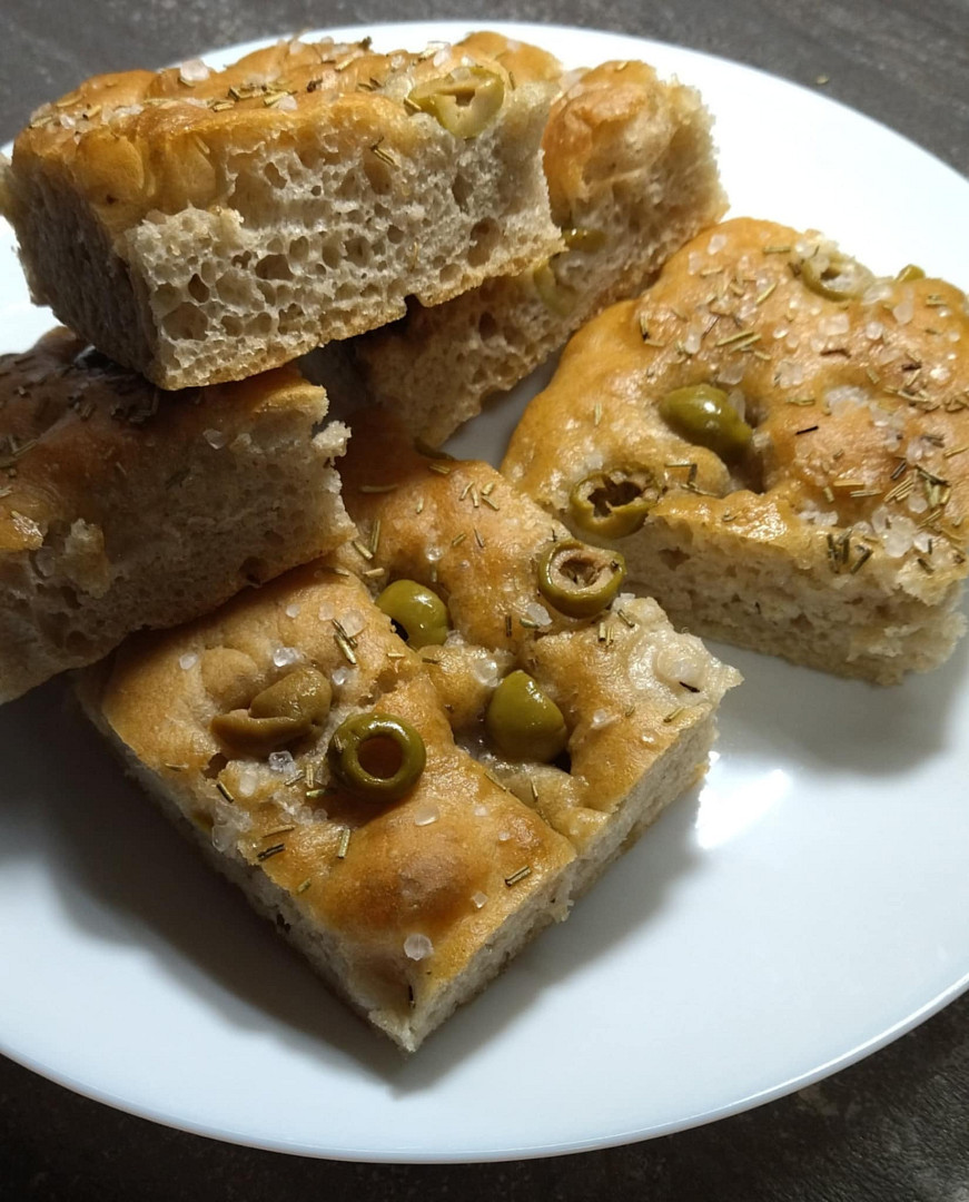 Focaccia je tradiční kynutý italský chléb. Krásně nadýchané těsto posypané hrubou solí, rozmarýnem a olivami přináší pravou středomořskou chuť a skvěle se hodí jako příloha i samostatná svačina.